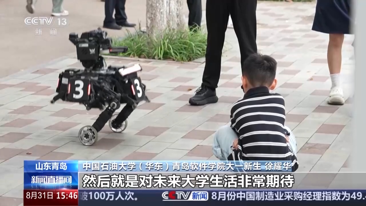 在山东青岛,中国石油大学(华东)校园门口、道路两旁,随处可见迎接新生的横幅,场面热烈,迎新氛围满满。在一处报名处,两个智能机器人和一只机器狗,引来众人围观。