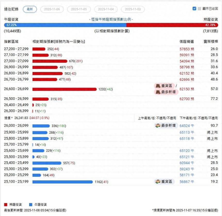 中信证券牛熊证街货分布图中的数据显示,熊证街货重货区和最多新增都在26600-26699区间,该区间最新熊证数量为1232张,较上一交易日增加42张。